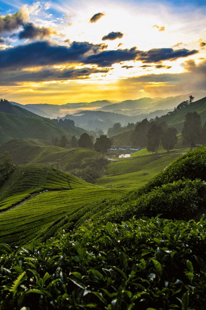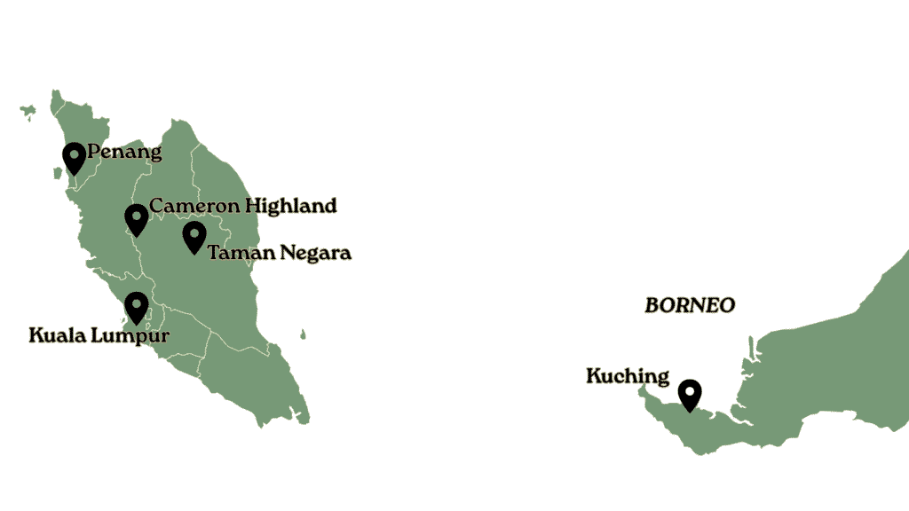 Despertamos sin prisa. Un paseo corto a la orilla, un último chapuzón, algún “hasta pronto” al bosque. Cerramos mochilas y ponemos rumbo a Cameron Highlands. El verde cambia de piel, de selva densa a colinas de té. Baja la temperatura, suben las ganas de una taza humeante. La siguiente etapa empieza con aire fresco y vistas en terrazas.